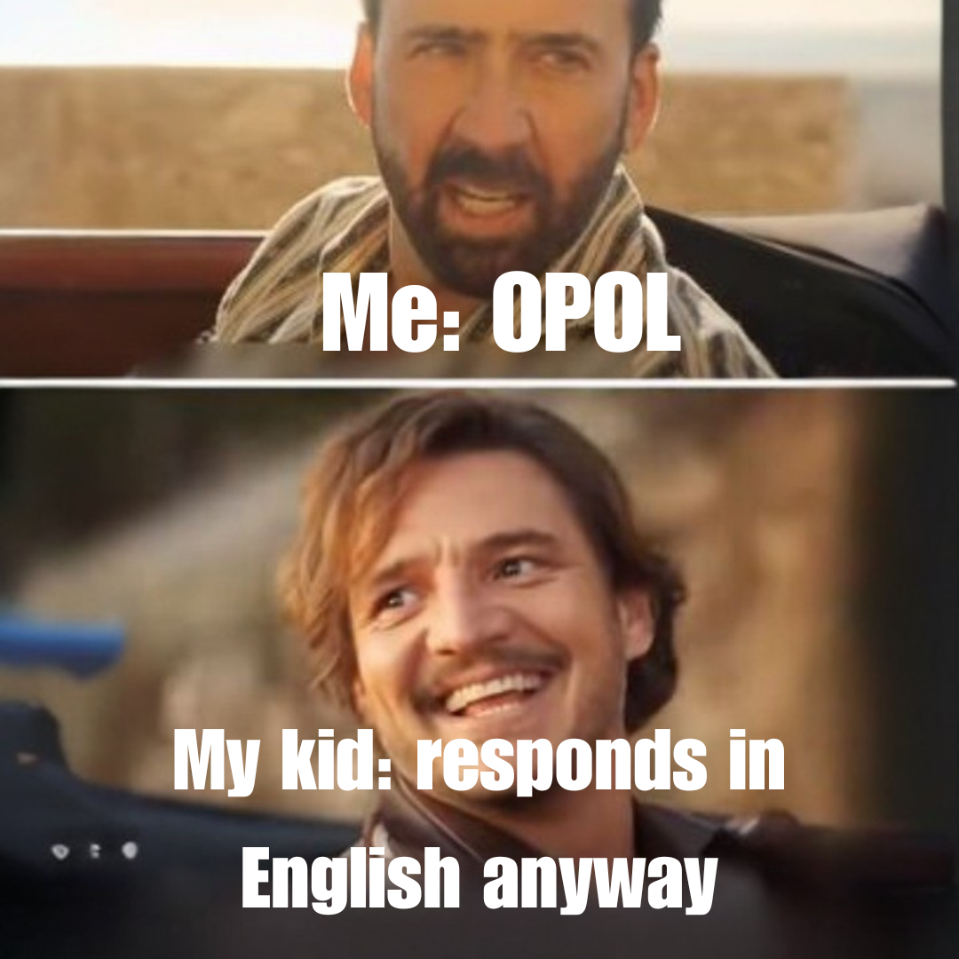 ✔️ you have been following One Parent One Language (OPOL) since your child was born. You're doing everything "by the book" but your child still treats your language like background music at a restaurant.